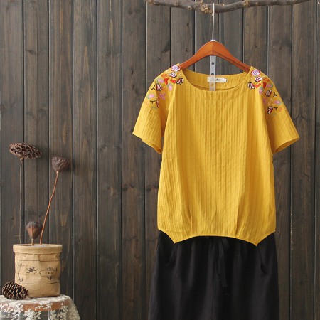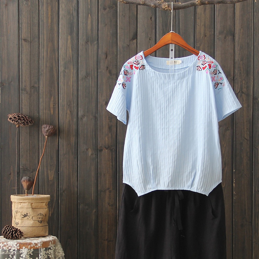 Summer New Ethnic Style Cotton and Linen Women's Tops Wild Literary Embroidery Short-Sleeved T-Shirt Women